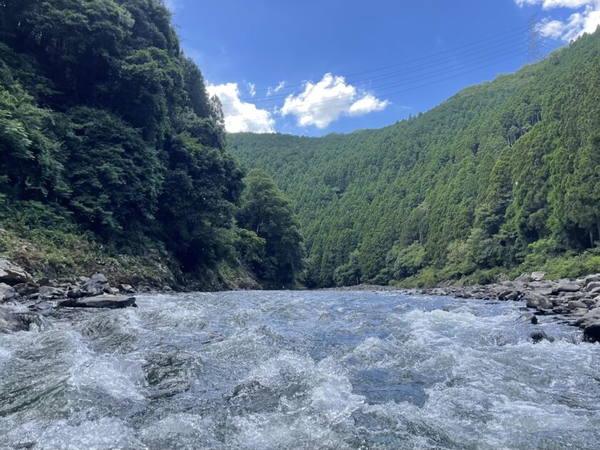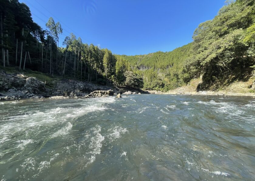確保したもののこのままでは大高瀬に流されるので小鮎の滝から下ってきた遊船まで上流に向かい一生懸命パドリングし、何とか手渡しました…💦