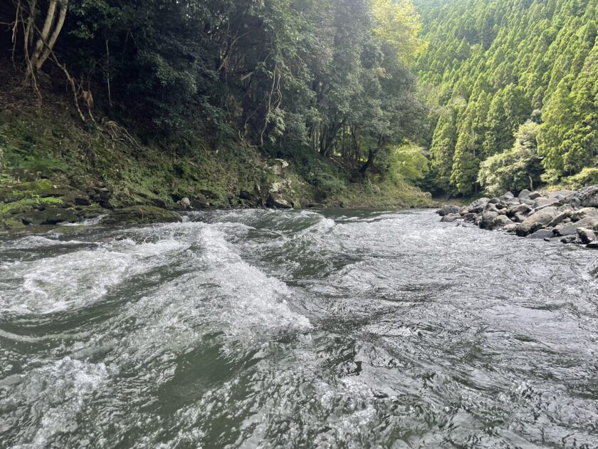 獅子ヶ口の瀬下流約120m 左岸の木陰から微笑んでいます。